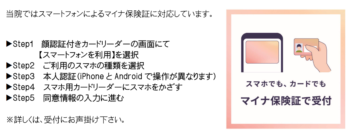 | 受付 | 午前8時30分〜受付開始致します。 初診の方は問診票をご記入いただきます。 ※初診時および月初めの受診の際には下記のいずれかを必ずご提示下さい。 ・マイナ保険証(スマートフォンのマイナ保険証も利用可能です) ・健康保険証 ※有効期限が記載されている場合その期限まで、記載がない場合は最長で 令和7年12月1日まで ※令和7年12月2日以降はご利用いただけません ・資格確認書 ・マイナ保険証+資格情報のお知らせ ※資格情報のお知らせのみでは受診できません。 ご提示がない場合は、全額自費となることがあります。 また、再診の際、氏名・住所・電話番号・保険情報などに変更がありましたら、 受付までお申し出ください。 なお、転職後等保険情報が変更になった直後等においては、オンライン資格確認で 保険情報を確認できない場合があります。その際は、【被保険者資格申立書】を ご記入いただくことがありますので、ご協力をお願いします。 詳しくはこちら↓ 被保険者資格申立書に関する説明書 ※紹介状をお持ちの方は窓口にご提出ください。 ※スマートフォンのマイナ保険証による受付につきましては、下記を参照下さい。 |