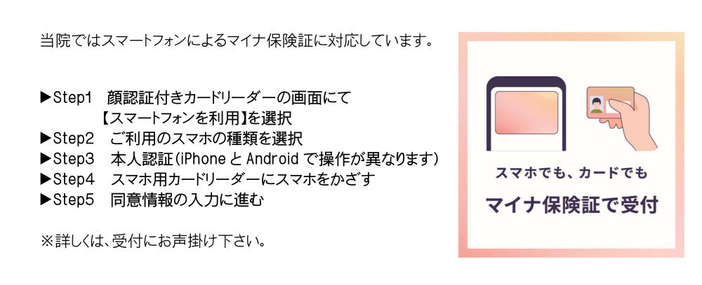 | 受付 | 午前8時30分〜受付開始致します。 初診の方は問診票をご記入いただきます。 ※初診時および月初めの受診の際には下記のいずれかを必ずご提示下さい。 ・マイナ保険証(スマートフォンのマイナ保険証も利用可能です) ・健康保険証 ※有効期限が記載されている場合はその期限まで、記載がない場合は最長で 令和7年12月1日まで ※令和7年12月2日以降はご利用いただけません ・資格確認書 ・マイナ保険証+資格情報のお知らせ ※資格情報のお知らせのみでは受診できません。 ご提示がない場合は、全額自費となることがあります。 また、再診の際、氏名・住所・電話番号・保険情報などに変更がありましたら、 受付までお申し出ください。 なお、転職後等保険情報が変更になった直後等においては、オンライン資格確認で 保険情報を確認できない場合があります。その際は、【被保険者資格申立書】をご記入 いただくことがありますので、ご協力お願いします。 詳しくはこちら↓ 被保険者資格申立書に関する説明書 ※紹介状をお持ちの方は窓口にご提出ください。 ※スマートフォンのマイナ保険証による受付につきましては、下記をご参照ください。 |